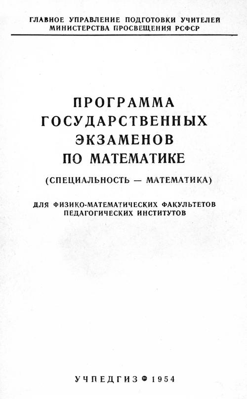 Программа государственных экзаменов по математике для специальности «Математика» педагогических институтов. — 1954