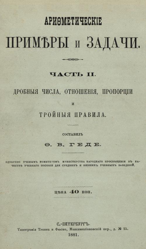 Геде Ф. В. Арифметические примеры и задачи. Ч. 2. Дробные числа, отношения, пропорции и тройные правила. — 1881