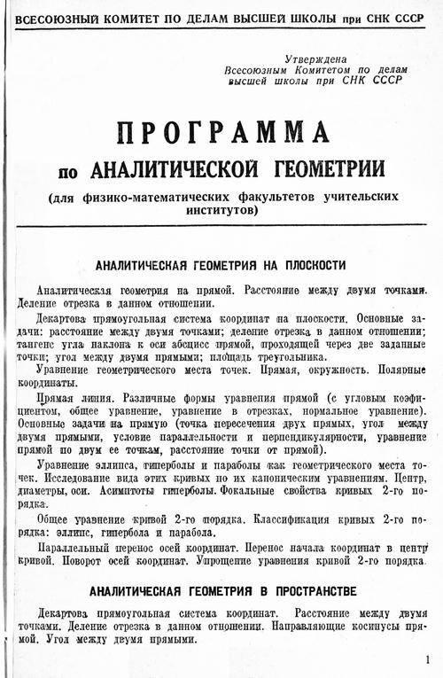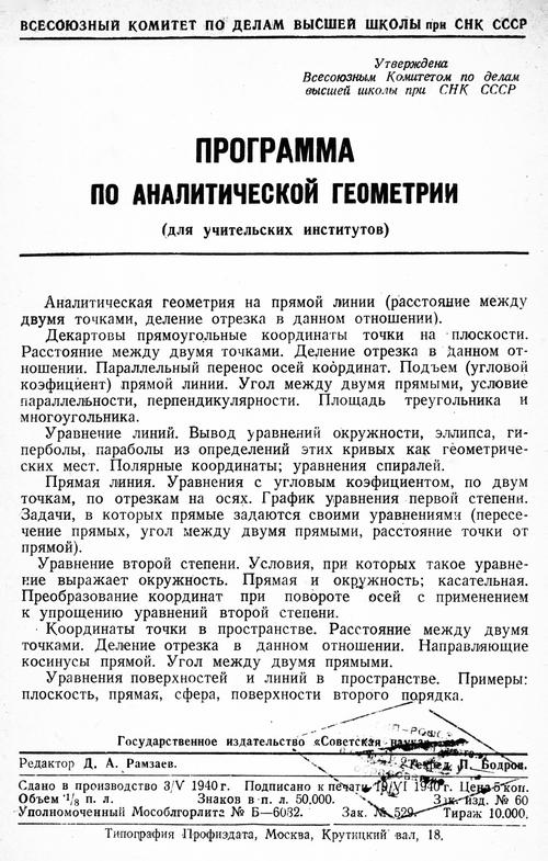 Программа по аналитической геометрии для учительских институтов. — 1940