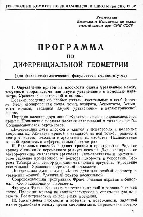 Программа по дифференциальной геометрии для педагогических институтов. — 1940