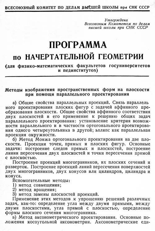 Программа по начертательной геометрии для госуниверситетов и педагогических институтов. — 1940