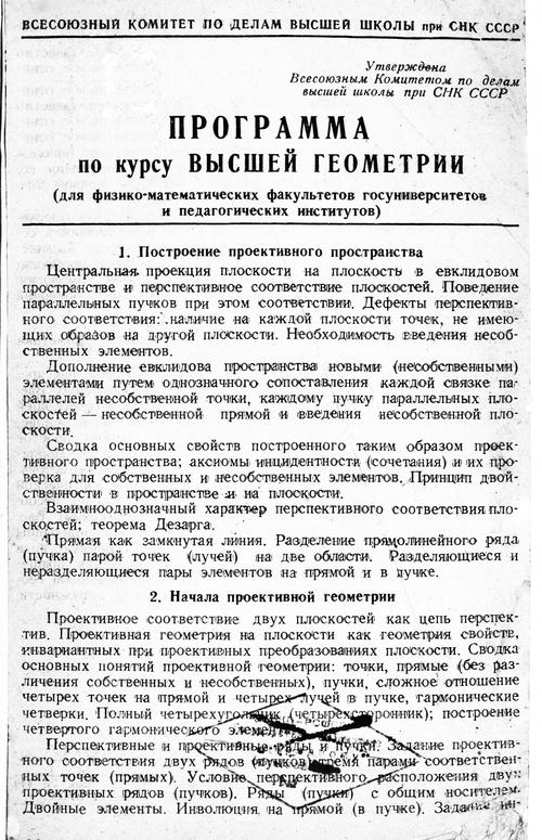 Программа по курсу высшей геометрии для госуниверситетов и педагогических институтов. — 1941