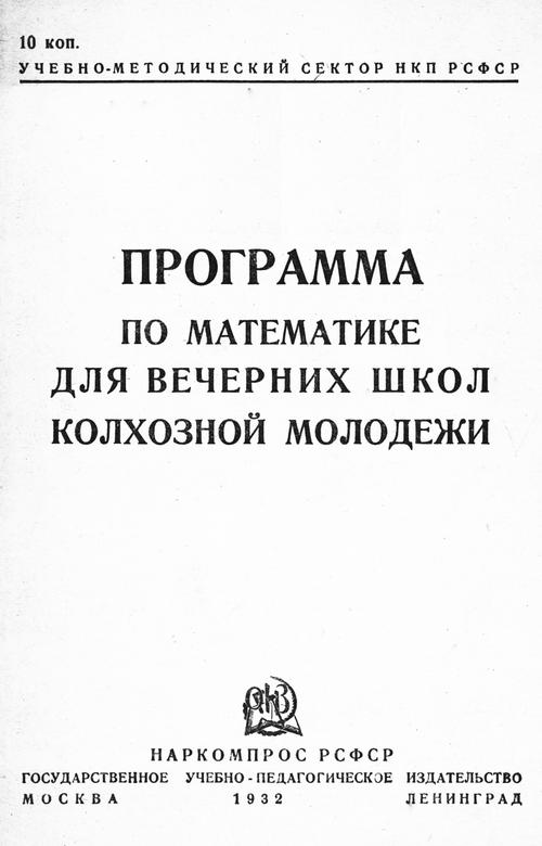 Программа по математике для вечерних школ колхозной молодежи. — 1932
