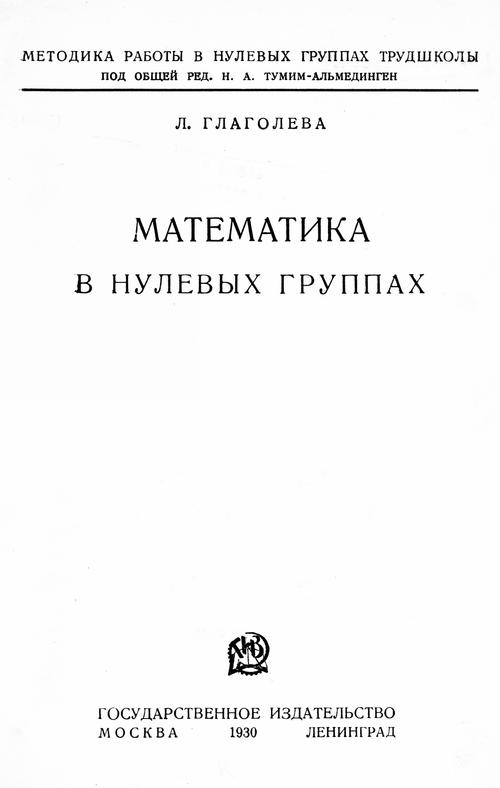 Математика в нулевых группах. — М. ; Л. : Гос. изд-во, 1930. — 48 с. — (Методика работы в нулевых группах трудшколы / под общей ред. Н. А. Тумим-Альмединген). — Библиогр.: с. 46.