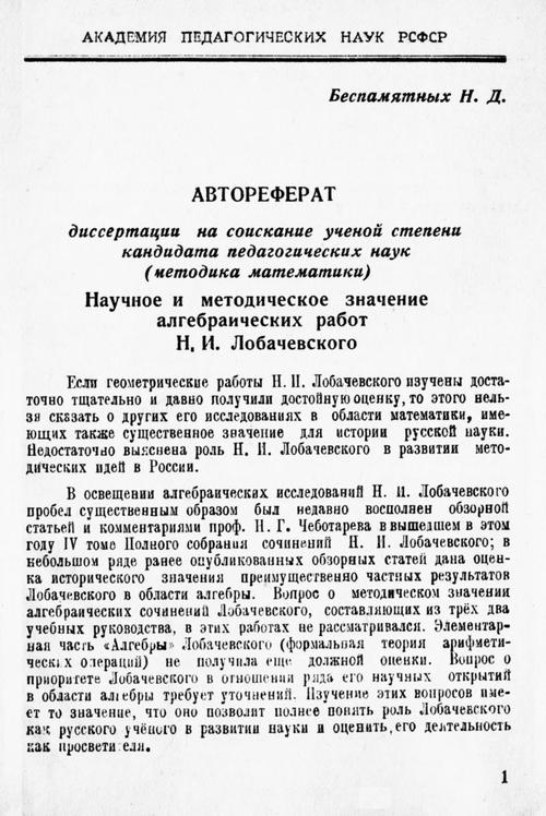 Александров И. И. Памяти великого русского математика XIX столетия Н. И. Лобачевского. — 1892  Александров И. И. Памяти великого русского математика XIX столетия Н. И. Лобачевского : читано на акте Тамбовской гимназии в 1882 г. — Тамбов : тип. Губ. правления, 1892. — 15 с. Васильев А. В. Николай Иванович Лобачевский. — 1992  Васильев А. В. Николай Иванович Лобачевский, 1792—1856 / Рос. акад. наук ; [отв. ред. А. П. Юшкевич ; изд. подготовили В. А. Бажанов, А. П. Широков]. — М. : Наука, 1992. — 232 с. — (Научно-биогр. серия). — Библиогр. в прим. — Список соч. Н. И. Лобачевского: с. 217—219 (22 назв.). Вселенная Лобачевского: к 100-летию Нижегородского государственного университета. — 2015  Вселенная Лобачевского = Lobachevsky Universitas : к 100-летию Нижегородского государственного университета им. Н. И. Лобачевского / сост. Р. В. Голубин, Е. Н. Емельянова, И. С. Ильина [и др.] ; пер. на англ. В. Н. Подгускова, Е. Б. Ходыревой. — Н. Новгород, 2015. — 156 с. — Библиогр.: с. 155. Празднование Казанским университетом столетия геометрии Н. И. Лобачевского. — 1927  Празднование Казанским университетом столетия открытия неэвклидовой геометрии Н. И. Лобачевским. — [Казань] : изд. Казан. физ.-мат. о-ва при Казан. ун-те, 1927. — 112 с. Беспамятных Н. Д. Научное и методическое значение алгебраических работ Лобачевского. — 1949  Беспамятных Н. Д. Научное и методическое значение алгебраических работ Н. И. Лобачевского : автореф. дис. ... канд. пед. наук (методика математики) / Акад. пед. наук РСФСР. — [Гродно, 1949]. — 6 с. Якунин П. Ф. Н. И. Лобачевский и начальное образование в Казанском учебном округе. — 1955  Якунин П. Ф. Н. И. Лобачевский и начальное образование в Казанском учебном округе : автореф. дис. ... канд. пед. наук / Моск. ордена Ленина и ордена Красного знамени гос. ун-т им. М. В. Ломоносова. Кафедра педагогики. — М., 1955. — 14 с. Норден А. П., Лаптев Б. Л. Н. И. Лобачевский. — 1960  Норден А. П., Лаптев Б. Л. Н. И. Лобачевский : диафильм для внеклассной работы в средней школе. — М. : студия «Диафильм», 1960. — [2], 53 кадра. Александров П. С. Несколько слов по поводу речи Лобачевского «О важнейших предметах воспитания». — 2008  Александров П. С. Несколько слов по поводу речи Лобачевского «О важнейших предметах воспитания» // Александров П. С. Введение в теорию групп. — М. : Бюро Квантум, 2008. — С. 133—146. Башмакова И. Г. Николай Иванович Лобачевский. — 1972  Башмакова И. Г. Николай Иванович Лобачевский // Детская энциклопедия. — Т. 2 — М. : Педагогика, 1972. — С. 455—457. Болгарский Б. В. Идеи Н. И. Лобачевского в области методики математики. — 1952  Болгарский Б. В. Идеи Н. И. Лобачевского в области методики математики // Математика в школе. — 1952. — № 2. — С. 1—7. Бородаев М. М. Математический вечер для учащихся VI—VII классов, посвящённый памяти Н. И. Лобачевского. — 1955  Бородаев М. М. Математический вечер для учащихся VI—VII классов, посвящённый памяти Н. И. Лобачевского // Из опыта проведения внеклассной работы по математике в средней школе : сб. статей. — М. : Учпедгиз, 1955. — С. 176—187. Жаров С. В. Геометрические идеи Н. И. Лобачевского (к 225-летию со дня рождения). — 2017  Жаров С. В. Геометрические идеи Н. И. Лобачевского (к 225-летию со дня рождения) // Математическое образование. — 2017. — № 1. — С. 48—51. Каган В. Ф. Н. И. Лобачевский. — 1963  Каган В. Ф. Н. И. Лобачевский // Каган В. Ф. Очерки по геометрии