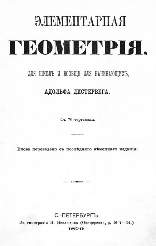 Элементарная геометрия : для школ и вообще для начинающих : вновь переведено с последнего немецкого издания. — СПб. : в тип. Н. Неклюдова, 1870. — [4], 109 с.