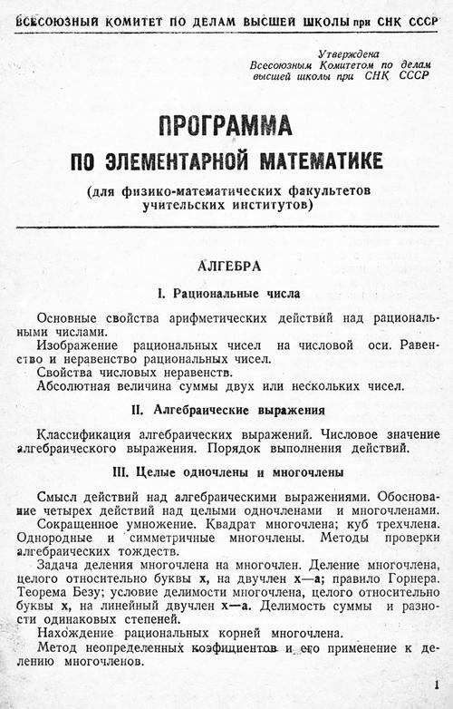 Программа по элементарной математике : (для физико-математических факультетов учительских институтов) / Всесоюзный комитет по делам высшей школы при СНК СССР. — М. : Сов. наука, 1940. — 8 с.