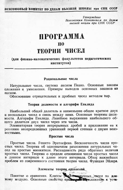 Программа по теории чисел : (для физико-математических факультетов педагогических институтов) / Всесоюзный комитет по делам высшей школы при СНК СССР. — М. : Сов. наука, 1940. — 2 с.