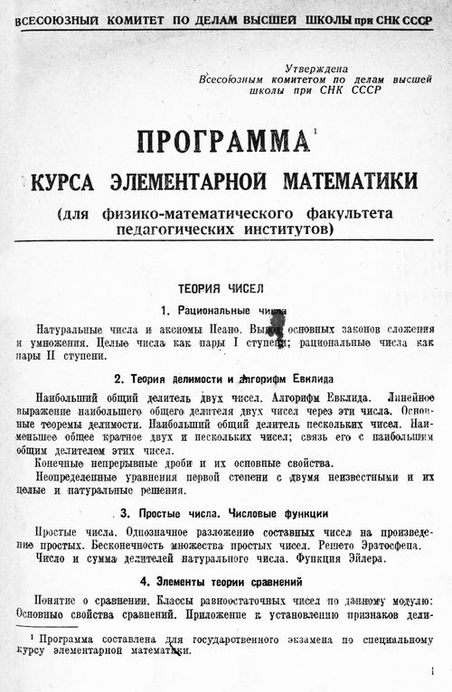 Программа курса элементарной математики : (для физико-математического факультета педагогических институтов) / Всесоюзный комитет по делам высшей школы при СНК СССР. — М. : Сов. наука, 1941. — 4 с.