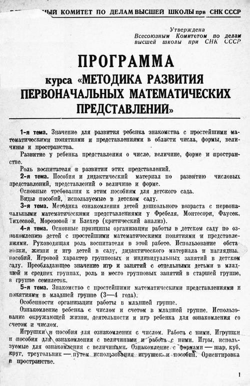 Программа курса «Методика развития первоначальных математических представлений» / Всесоюзный комитет по делам высшей школы при СНК СССР. — М. : Сов. наука, 1941. — 2 с.