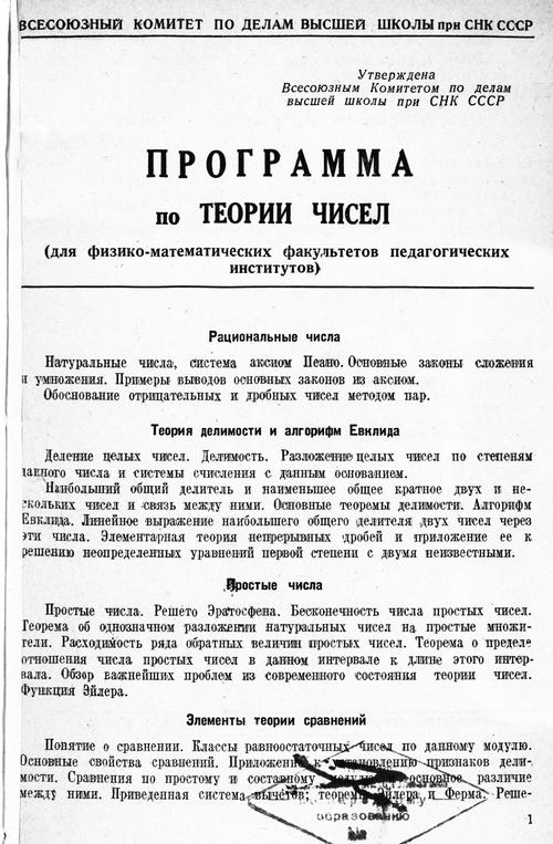 Программа по теории чисел : (для физико-математических факультетов педагогических институтов) / Всесоюзный комитет по делам высшей школы при СНК СССР. — М. : Сов. наука, 1941. — 2 с.
