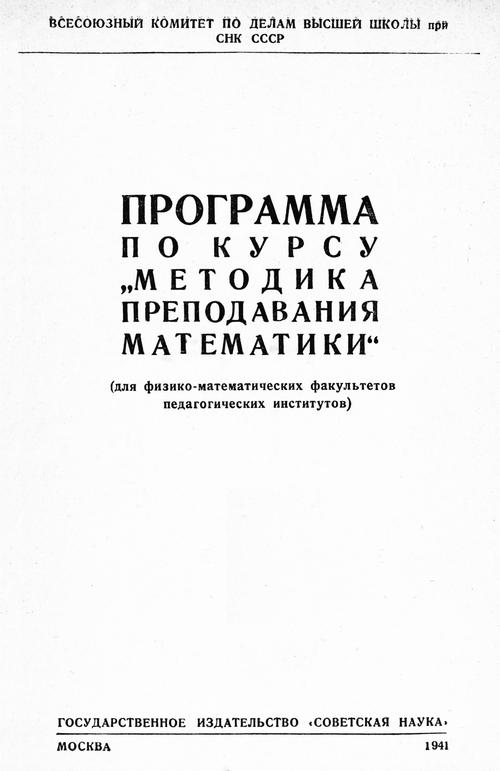 Программа по курсу «Методика преподавания математики» : для физико-математических факультетов педагогических институтов / Всесоюз. комитет по делам высшей школы при СНК СССР. — М. : Советская наука, 1941. — 12 с.