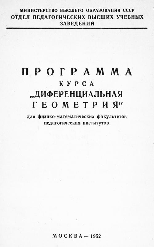 Программа курса «Дифференциальная геометрия» : для физико-математических факультетов педагогических институтов / М-во высшего образования СССР. Отдел пед. высших учеб. заведений ; [С. П. Фиников ; ред. М. В. Потоцкий]. — М., 1952. — 7 с.
