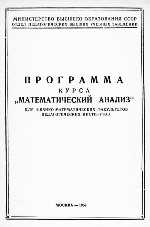 Программа курса «Математический анализ» для физико-математических факультетов педагогических институтов / М-во высшего образования СССР. Отдел высших gtl/ учеб. заведений ; [отв. ред. И. В. Смирнов]. — М., 1952. — 11 с.