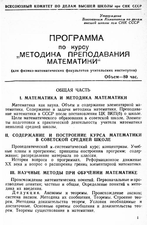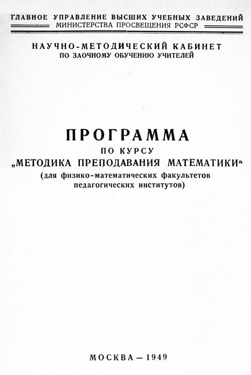 Программа по курсу «Методика преподавания математики» для педагогических институтов. — 1941  Программа по курсу «Методика преподавания математики» : для физико-математических факультетов педагогических институтов / Всесоюз. комитет по делам высшей школы при СНК СССР. — М. : Советская наука, 1941. — 12 с. Программа по курсу «Методика преподавания математики» для педагогических институтов. — 1949  Программа по курсу «Методика преподавания математики» : для физико-математических факультетов педагогических институтов / Гл. упр. высших учеб. заведений М-ва просвещения РСФСР. — М., 1949. — 12 с. Программа по курсу «Методика преподавания математики» для педагогических институтов. — 1950  Программа по курсу «Методика преподавания математики» : для физико-математических факультетов педагогических институтов / М-во высшего образования СССР. Отдел высших пед. учеб. заведений. — М., 1950. — [2], 11 с.