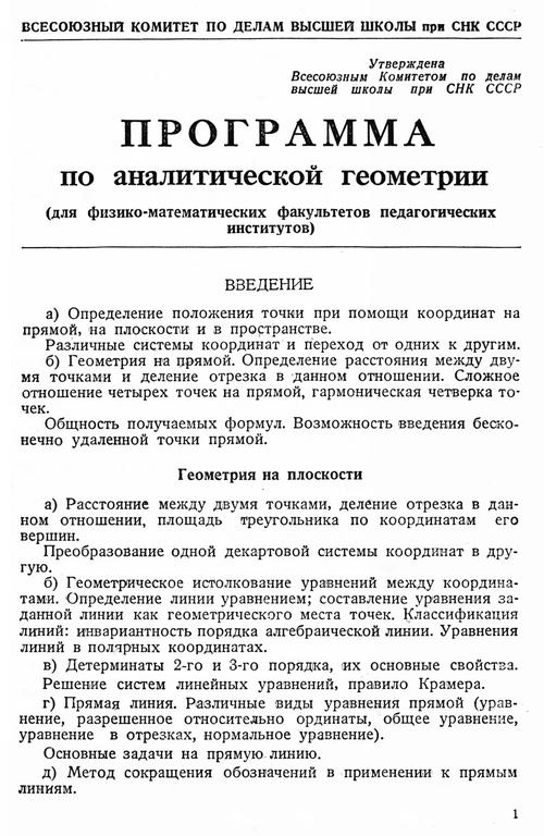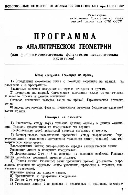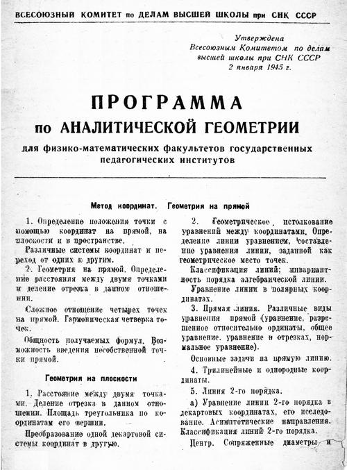 Программа по аналитической геометрии для педагогических институтов. — 1940  Программа по аналитической геометрии : (для физико-математических факультетов педагогических институтов) / Всесоюз. к-т по делам высшей школы при СНК СССР. — М., 1940. — 3 с. Программа по аналитической геометрии для педагогических институтов. — 1941  Программа по аналитической геометрии : (для физико-математических факультетов педагогических институтов) / Всесоюз. к-т по делам высшей школы при СНК СССР. — М., 1941. — 2 с. Программа по аналитической геометрии для педагогических институтов. — 1945  Программа по аналитической геометрии : (для физико-математических факультетов педагогических институтов) / Всесоюз. к-т по делам высшей школы при СНК СССР. — М., 1945. — 2 с.