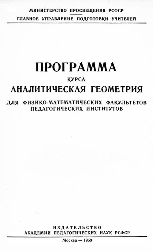 Программа курса «Математический анализ» для педагогических институтов. — 1952  Программа курса «Математический анализ» для физико-математических факультетов педагогических институтов / М-во высшего образования СССР. Отдел высших gtl/ учеб. заведений ; [отв. ред. И. В. Смирнов]. — М., 1952. — 11 с. Программа курса «Математический анализ» для педагогических институтов. — 1953  Программа курса «Математический анализ» для физико-математических факультетов педагогических институтов / М-во просвещения РСФСР. Гл. упр. подготовки учителей ; [ред. П. С. Новиков]. — М. : изд-во АПН РСФСР, 1953. — 11 с.