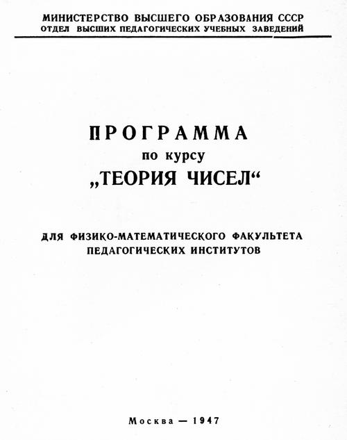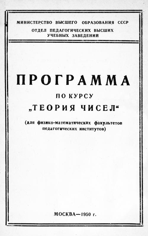 Программа по курсу «Теория чисел» для физико-математических факультетов педагогических институтов  Программа по курсу «Теория чисел» для физико-математических факультетов педагогических институтов / М-во высшего образования СССР. Отдел пед. высших учебных заведений. — М., 1950. — 6 с. Программа по курсу «Теория чисел» для физико-математического факультета педагогических институтов  Программа по курсу «Теория чисел» для физико-математического факультета педагогических институтов / М-во высшего образования СССР. Отдел высших пед. учебных заведений. — М., 1947. — 7 с.Программа по математике6