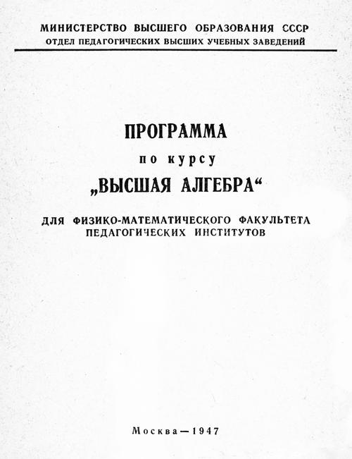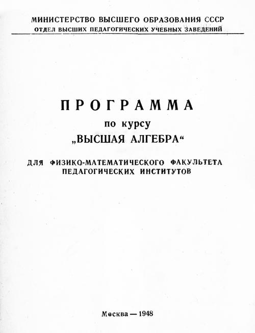 Программа по курсу «Высшая алгебра» для педагогических институтов. — 1947  Программа по курсу «Высшая алгебра» для физико-математического факультета педагогических институтов / М-во высшего образования СССР. Отдел высших пед. учебных заведений. — М., 1947. — 8 с. Программа по курсу «Высшая алгебра» для педагогических институтов. — 1948  Программа по курсу «Высшая алгебра» для физико-математического факультета педагогических институтов / М-во высшего образования СССР. Отдел высших пед. учебных заведений. — М., 1948. — 10 с.