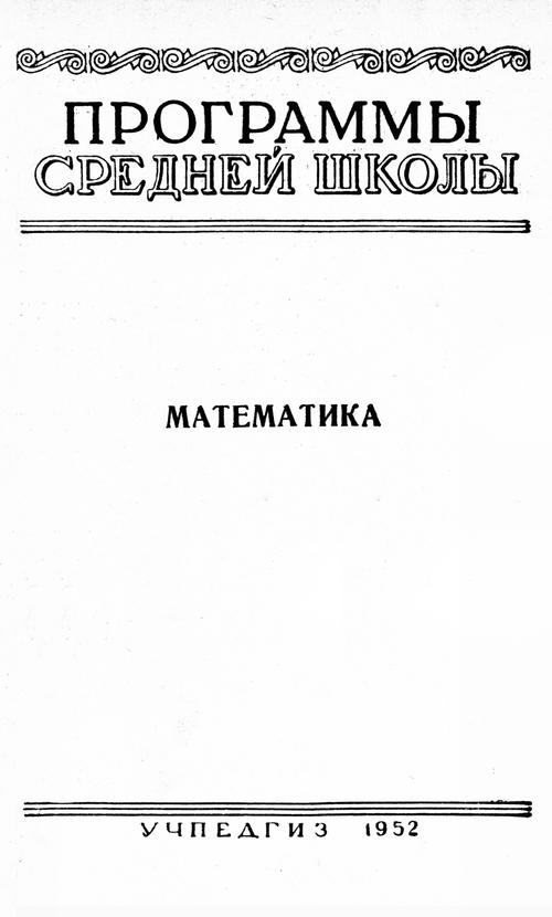 Программы средней школы. Математика. — 1938  Программы средней школы. Математика. Дополнительное издание. — М. : Наркомпрос РСФСР, 1938. — 22 с. Программы средней школы. Математика. — 1939  Программы средней школы. Математика / [ред. С. С. Бронштейн]. — М. : Наркомпрос РСФСР, 1939. — 22 с. Программы средней школы. Математика. — 1940  Программы средней школы. Математика. — М. : Наркомпрос РСФСР, 1940. — 22 с. Программы средней школы. Математика. — 1942  Программы средней школы. Математика / Упр. начальных и средних школ НКП РСФСР. — М. : Наркомпрос РСФСР, 1942. — 20 с. Программы средней школы. Математика. — 1943  Программы средней школы. Математика / Упр. начальных и средних школ НКП РСФСР. — М. : Наркомпрос РСФСР, 1943. — 16 с. Программы средней школы. Математика. — 1944  Программы средней школы. Математика. — М. : Наркомпрос РСФСР, 1944. — 19 с. Программы средней школы. Математика. — 1946  Программы средней школы. Математика. — М. : Учпедгиз, 1946. — 19 с. Программы средней школы. Математика. — 1947  Программы средней школы. Математика. — М. : Наркомпрос РСФСР, 1947. — 19 с. Программы средней школы. Математика. — 1948  Программы средней школы. Математика / Упр. школ М-ва просвещения РСФСР. — М. : Учпедгиз, 1948. — 30 с. Программы средней школы. Математика. — 1949  Программы средней школы. Математика / Упр. школ М-ва просвещения РСФСР. — М. : Учпедгиз, 1949. — 28 с. Программы средней школы. Математика. — 1950  Программы средней школы. Математика / Упр. школ М-ва просвещения РСФСР. — М. : Учпедгиз, 1950. — 30 с. Программы средней школы. Математика. — 1951  Программы средней школы. Математика / Упр. школ М-ва просвещения РСФСР. — М. : Учпедгиз, 1951. — 30 с. Программы средней школы. Математика. — 1952  Программы средней школы. Математика / Упр. школ М-ва просвещения РСФСР. — М. : Учпедгиз, 1952. — 30 с.